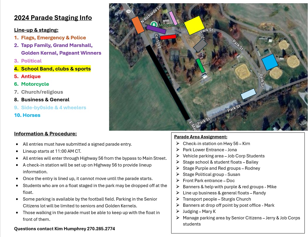 This year, the senior citizens parking spot will be roped off, manned by Jerry and Job Corp students. Those with a special parking permit will be allowed to park. The parking permits were given to the senior citizen staff and some members along with those riding on the Golden Kernel's float (Jaycees & Jaycettes). There are only 70 parking spaces total.